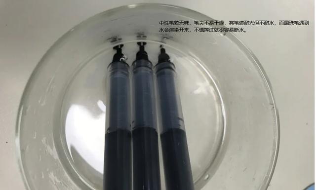 遇水的性质不同(www.Ws46.com) 中性笔较无味,笔尖不易干燥,其笔迹耐光但不耐水,而圆珠笔遇到水会渲染开来,不慎摔过就很容易断水。