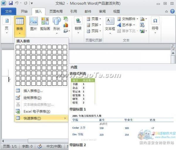 在工作中我们总是希望能够快速的制作出一个表格,今天小编为大家介绍一下如何在word2010中快速插入表格。 在word2010中有一个“快速表格”的功能,在这里我们可以找到许多已经设计好的表格样式,只需要挑选你所需要的,就可以轻松插入一张表格。
