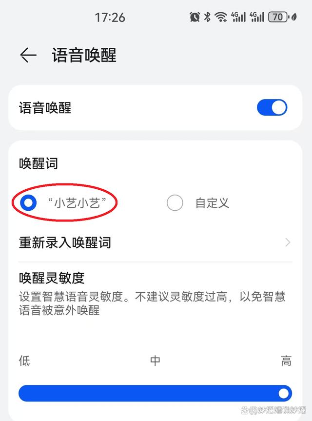 进入智慧语音页面后,我们就能看到一个语音唤醒功能,点击进入。接下来,我们将语音唤醒功能后面的开关给它打开,然后按照要求设置唤醒词。比如我们选择的唤醒词是“小艺小艺”,那么我们只需按照系统提示将唤醒词录入好就可以了。