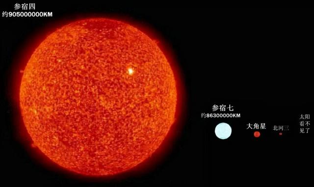 如果把参宿四与太阳的互换位置,由于它的半径达到了太阳的1180倍,所以参宿四的最外层将到达木星附近,就会发现猎户座的左肩出现了一颗亮度超过满月的新天体。