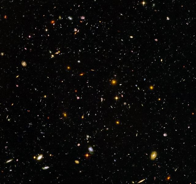 在哈勃望远镜于2003年公布的超级深场中,天文学家们让哈勃瞄准3平方角分范围的一小部分天区,持续曝光了100万秒,最终在这张照片中发现了1万个星系,不要忘了,这还只是全天区面积的1270万分之一,跟针尖的大小差不多。
