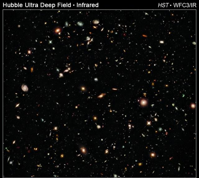 2012年,哈勃望远镜用同样的办法获得了哈勃极深场,这次的曝光持续了50天,观测范围是全天区面积的3200万分之一,最终获得了5500个星系的成像,其中最古老的星系远在132亿光年外,几乎就是宇宙大爆炸后诞生的第一批星系。