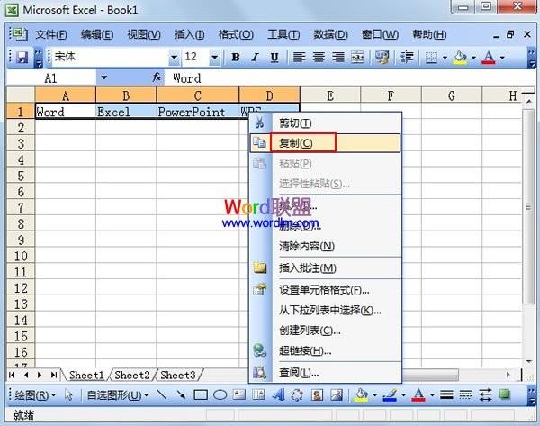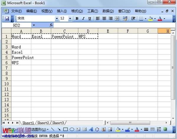 ①启动Excel2003,输入行数据,然后选中这些单元格,复制。