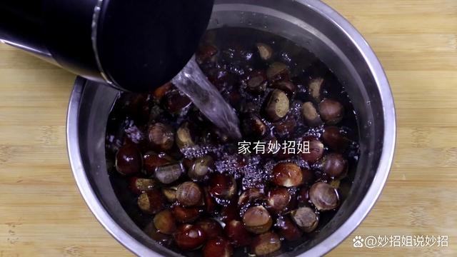 接下来,再准备一个大点的容器,把开好口的板栗都放在容器中,然后烧一壶开水,把开水倒入板栗中,水的量要将板栗完全淹没。就这样利用开水将板栗泡上十分钟左右。这个浸泡的过程非常重要,因为经过开水的浸泡,板栗的外壳会变软。同时,板栗里面的一层绒毛也会受热膨胀。这样一来,在绒毛与板栗肉之间就会存在一定的缝隙,为我们后续轻松剥掉绒毛提供了便利。