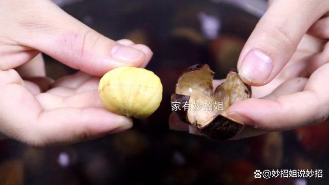 我们只需要在板栗开口的地方往两边一掰,板栗的外壳就很容易地剥开了,里面的绒毛也跟着一起剥了下来。就算是板栗肉上面还粘有少许的绒毛,我们用指甲一抠,也能很轻松地抠下来。