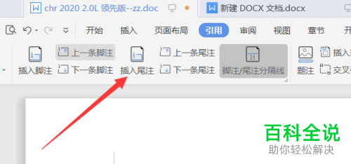 3. 第三步在【引用】菜单栏中,根据下图箭头所指,点击【插入尾注】选项。