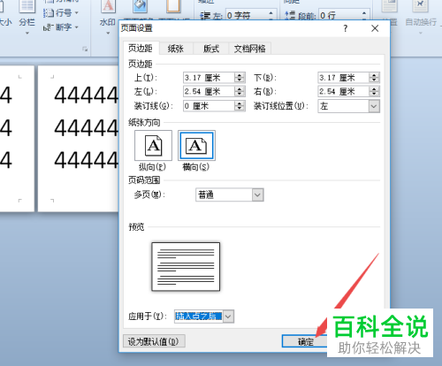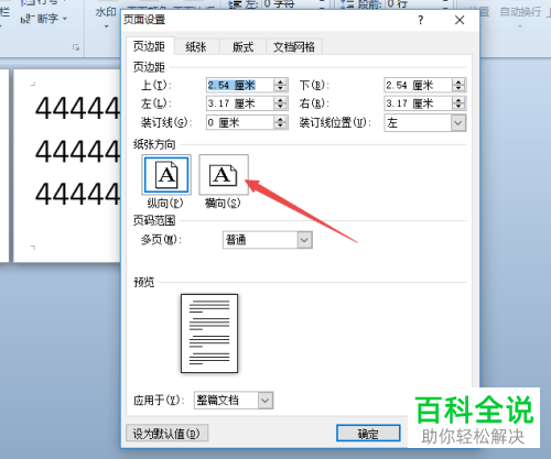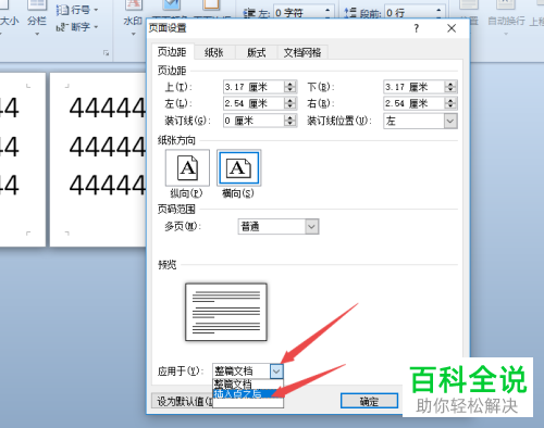 5. 第五步,在弹出的页面设置窗口中,选择横向选项,并点击应用范围右侧的下拉箭头。