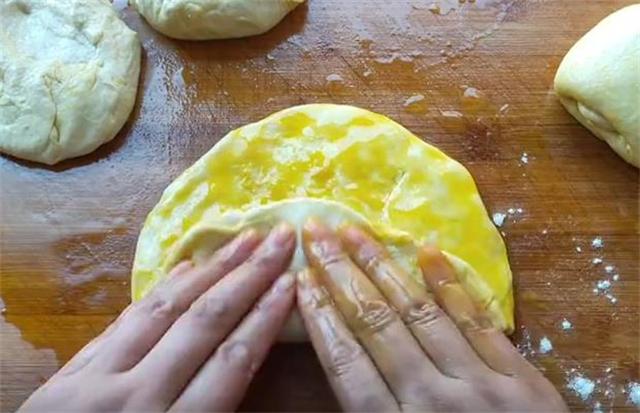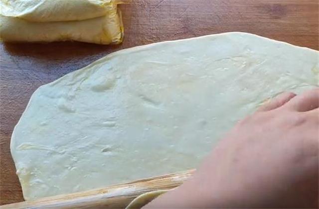 3.把面剂按薄,涂抹一层油和干面粉,起到油酥的作用,上下折叠,再左右折叠,这样生胚就做好了。