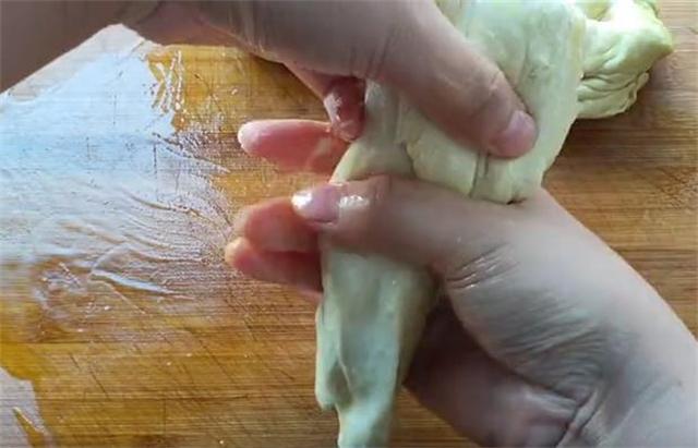 2.大概是5到20分钟之后,我们案板上抹一些油,把醒好的面直接抻成长条分成4份,不需要揉,揉的话起劲反而会变硬。