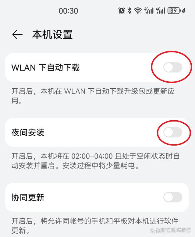 接着,会弹出一个新的菜单,选择“本机设置”。在本机设置页面中,你可以看到“WLAN 下自动下载”和“夜间安装”这两个开关按钮,它们默认都是打开状态的。为了避免系统自动更新,你需要分别点击这两个开关按钮,将其关闭。当开关按钮变成灰白色时,就表示已经成功关闭。