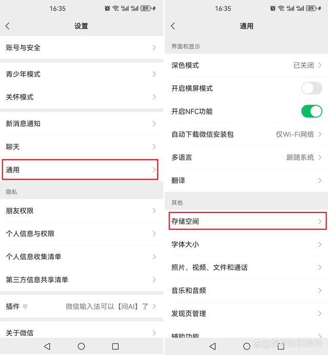 此外,微信作为我们装机必备的软件,使用的频率也非常高,这样就导致微信占用了不少手机内存,导致手机越来越卡,那么这个时候,我们就需要将微信的内存给清理一下了。方法很简单,首先打开微信的设置页面,然后点击通用,接着选择存储空间。进入页面后我们稍等几秒钟,系统会自动核算出我们微信使用的内存情况。