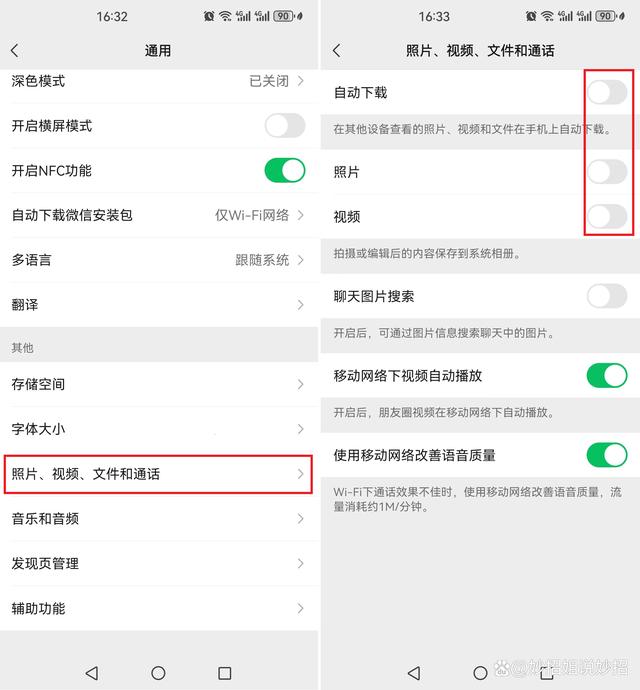 除了对微信的存储空间进行清理外,我们还要将自动下载的开关关闭,不然微信没有使用多久,就又会占用大量的内存了。同样的先来到通用页面,然后选择照片、视频、文件和通话。进入页面后我们就会看到一个自动下载的开关。如果开关是开启的,那么就表明查看的照片、视频和文件都会在手机上自动下载,我们就最好选择将它关闭。而下方的照片和视频的开关也都给它关闭,这样系统就不会自动将照片或编辑后的内容保存到系统相册,占用我们的手机空间了。
