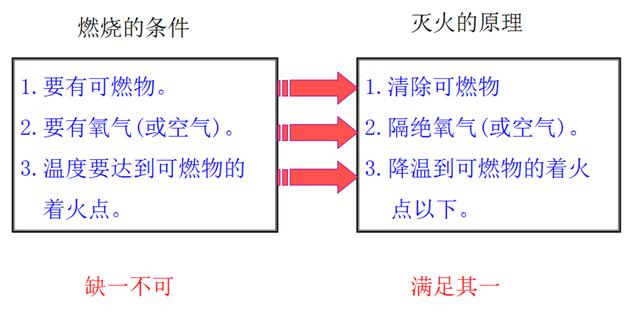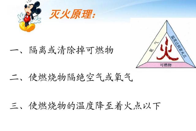 灭火的原理(破坏燃烧的条件,即可达到灭火的目): 清除可燃物或使可燃物与其他物品隔离; 使可燃物与氧气(或空气)隔绝。; 降低可燃物的温度,使其降低到着火点以下。