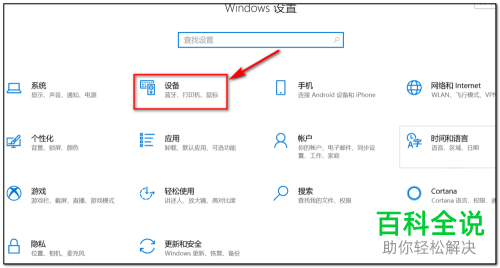 2. 第二步,来到下图所示的Windows设置页面中,点击箭头所指的设备选项。