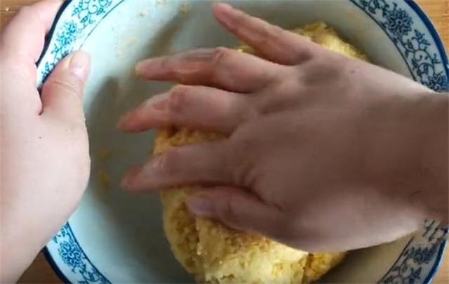 2.接下来把蒸好的小米倒入大的碗中,加入适量清水,加入适量的盐,再加一些味精和十三香,加盐就是调一个底味,搅拌均匀之后放入2到3克的小苏打,加入小苏打会更加的酥脆,然后加入适量的面粉,把它揉成面团,在揉的过程中手上沾一些油,这样防止粘手。