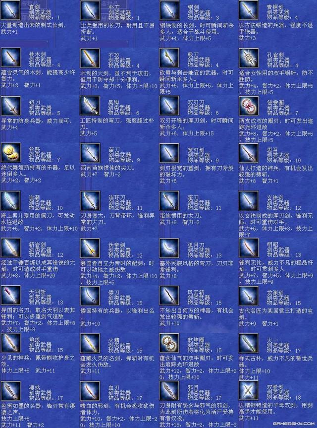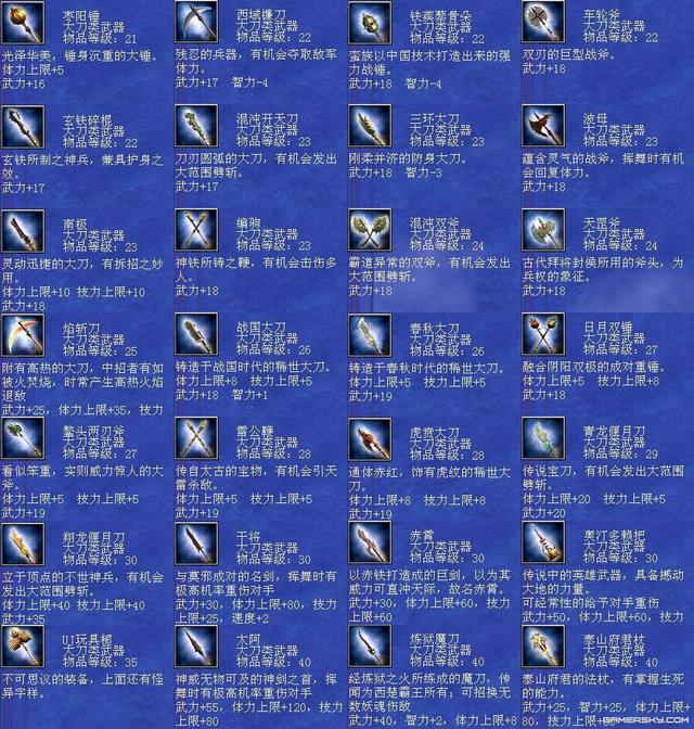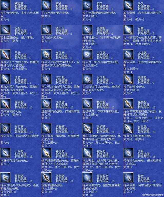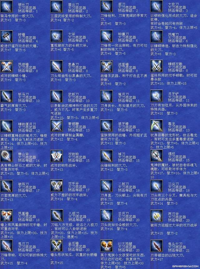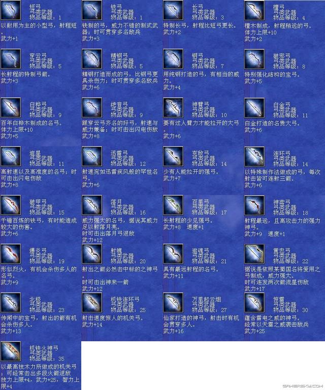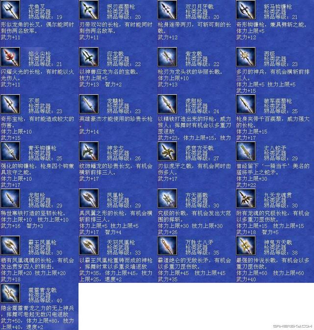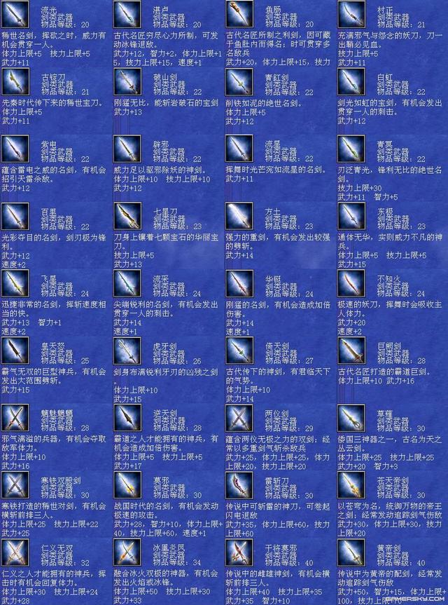 三国群英传7是一款非常受欢迎的角色扮演类游戏,其中武器系统是游戏中的重要组成部分之一。每个武器都有自己独特的属性和效果,可以为玩家提供不同的帮助和支持。本文将为您详细介绍三国群英传7武器编号及其相关内容。 首先,三国群英传7中的武器编号共有三个部分,分别是武器类型、品级和编号。武器类型包括长枪、大刀、铁斧、弓箭等多种类型,品级则分为普通、优良、精良、完美、神器五个级别。最后,编号则是指每个具体的武器在种类和品级确定后所对应的编号。 编号排序 1、震雷青龙戟,编号:804。 2、黄帝剑,编号:823。 3、炼狱魔刀,编号:826。 4、干将莫邪,编号:91。 5、泰山府君杖,编号:112 。 6、神鬼方天戟,编号:157。 7、万胜丈八矛,编号:159。 8、机铁火神弓,编号:111。 9、天羽凤凰枪,编号:833。 10、苍天帝剑,编号:850。 三国群英传7的十大武器包括紫电、贲育、霸王枪、丈八蛇矛、方天画戟、青龙偃月刀、金龙连弩、雌雄双股剑、凤凰羽扇和青虹剑等。这些武器都有着不同的属性和效果,可以为玩家提供极大的帮助和支持。 每个武器都具有独特的性质和功效。例如,紫电可以增加攻击力和射程,贲育则可以增加闪避和格挡率。霸王枪可以增加攻击力和暴击率,丈八蛇矛则可以增加攻击范围和穿透力。方天画戟可以增加攻击力和攻击距离,青龙偃月刀可以增加攻击力和暴击率,金龙连弩可以增加攻击速度和射程,雌雄双股剑可以增加攻击力和格挡率,凤凰羽扇则可以增加攻击力和攻击距离。青虹剑是一把全能的武器,可以同时增加攻击力、防御力和移动速度等属性。 另外,想要获得这些十大武器并不容易,需要玩家在游戏中完成各种任务、挑战和探索。有些武器甚至需要从BOSS或其他特殊场景中获取。因此,玩家需要耐心地积累经验并不断提升自己的实力,才能有机会获得这些顶级武器。 其次,每个武器的属性和效果都是不同的,需要根据不同的需求和游戏情况选择相应的武器。例如,长枪可以增加攻击距离和攻击范围,而大刀则可以增加攻击力和暴击率。铁斧则可以增加打断和撞击效果,弓箭则可以增加攻击速度和射程等。 另外,玩家还可以通过购买、探索、任务奖励等多种方式获得各种类型和品级的武器。在游戏中,一些重要的任务和剧情中也会出现与武器相关的线索或提示,玩家需要认真阅读说明和对话,探索相关地点,寻找符合条件的武器,并按照游戏设定的要求完成任务。 三国群英传7武器大全 全武器编号属性与技能剑类大全: 42 干将莫邪 剑 等级40 武力 22 智力 10 体力 35 技力 35 速度 1 忠诚 16 分身斩 神剑闪华 莲花轰天 泰山压顶 黄龙天翔 军魂 诅咒 横斩前排三人 43 草剃 剑 等级30 武力 17 智力 1 体力 10 技力 10 忠诚 10 分身斩 月轮烈光斩 食尸鬼阵 九尾妖狐 借尸还魂 童子降临 姬降临 倭国三神器 44 冰凰炎凤 剑 等级29 武力 16 体力 8 技力 8 忠诚 12 八方斩 水龙狂涛 火龙怒焰 全面补强 结构破坏 迅雷 附加火焰/冰冻攻击 45 仁义无双 剑 等级29 武力 17 智力 1 体力 10 技力 10 忠诚 12 八方斩 黄龙天翔 夺气术 通天之眼 绝地之眼 王道 恢复体力 46 寒铁双股剑 剑 等级28 武力 16 智力 1 体力 5 技力 5 忠诚 12 八方斩 夺气术 通天之眼 横斩前排三人 47 巨阙剑 剑 等级28 武力 16 体力 10 忠诚 10 八卦斩 地龙极震 天剑神威 杀气 霸道巨剑 48 魑魅魍魉 剑 等级28 武力 16 体力 10 邪灵妖刃 食尸鬼阵 魔灵刀兵 借尸还魂 尸魂 吸收敌人体力 49 逆天剑 剑 等级28 武力 17 体力 5 技力 5 忠诚 12 分身斩 神剑闪华 月轮烈光斩 天灯照影 端正军纪 王道 加倍伤害 50 倚天剑 剑 等级27 武力 14 体力 10 忠诚 10 分身斩 神剑闪华 增加经验 古代的神剑,有君临天下的气势 51 虎牙剑 剑 等级26 武力 15 体力 10 忠诚 10 噬血魔刃 地龙震 御飞刀 杀气 凶残之剑 52 皇天怒 剑 等级25 武力 15 忠诚 10 八方斩 破城神鎚 月轮烈光斩 局部破坏 大范围劈斩 53 飞星 剑 等级24 武力 13 智力 1 速度 2 忠诚 12 天剑神威 神剑闪华 假传待命 迅捷非常之剑 54 流采 剑 等级24 武力 14 智力 1 忠诚 12 天剑神威 假传冲锋 贯穿一人 55 华铤 剑 等级24 武力 14 智力 1 忠诚 12 神剑闪华 端正军纪 加倍伤 58 方土 剑 等级23 武力 14 忠诚 12 地龙极震 挪移阵 大略侦察 较强劈斩 59 东极 剑 等级23 武力 15 体力 5 技力 5 忠诚 12 铁轮血斩阵 土遁隐杀 挪移大法 大略清野 四极神兵 60 破山剑 剑 等级22 武力 13 忠诚 10 地龙 天剑斩 土遁隐杀 拨云见日 斩岩破石的宝剑 61 青釭剑 剑 等级22 武力 12 忠诚 10 三圣华斩 神剑闪华 铁轮血斩阵 天狗吞日 绝世名剑 62 白虹 剑 等级22 武力 12 忠诚 10 四方斩 暴击 贯穿一人 63 紫电 剑 等级22 武力 12 忠诚 10 雷击闪 浮雷 召引天雷杀敌 64 辟邪 剑 等级22 武力 12 体力 10 技力 10 忠诚 10 四方斩 风龙 冲阵消除 驱邪除妖的神剑 65 流星 剑 等级22 武力 11 忠诚 10 四方斩 水龙 大略清野 66 青冥 剑 等级22 武力 11 智力 5 技力 30 忠诚 10 四方斩 地龙 冲阵消除 67 百里 剑 等级22 武力 12 速度 2 忠诚 10 四方斩 火龙 大略侦察 68 村正 剑 等级21 武力 11 技力 5 忠诚 9 地狱之门 隐忍镖 铁轮血斩 霜雪覆地 69 古碇刀 剑 等级21 武力 11 体力 5 忠诚 9 御飞刀 三日月斩 半月斩 风云变色 70 流光 剑 等级20 武力 11 体力 5 技力 5 忠诚 9 剑轮舞 三日月斩 贯穿 72 太一 剑 等级17 武力 11 体力 10 忠诚 8 神剑闪 