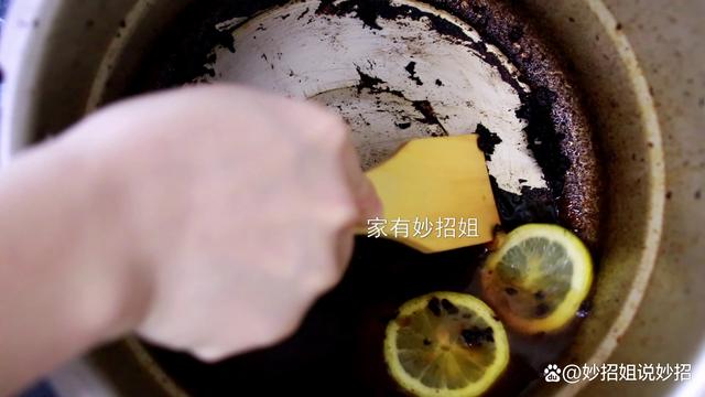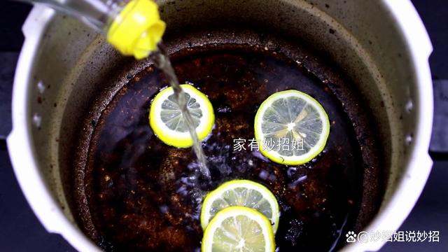 方法特别简单,只需要切上几片柠檬放置在烧黑的锅中,然后往里面倒入多一些的白醋,白醋一定要稍微多倒点。因为白醋中的醋酸具有很好的软化作用,它可以有效地软化烧焦的黑垢,使黑垢能更容易去除。倒好后,我们将锅拿起来摇晃一下,这一步的目的就是可以使锅的四周都沾上白醋,让白醋能充分发挥作用。柠檬和白醋一样里面都含有醋酸,能有助于黑垢的去除,而且柠檬味道清新,它能掩盖掉锅具烧过后的异味。
