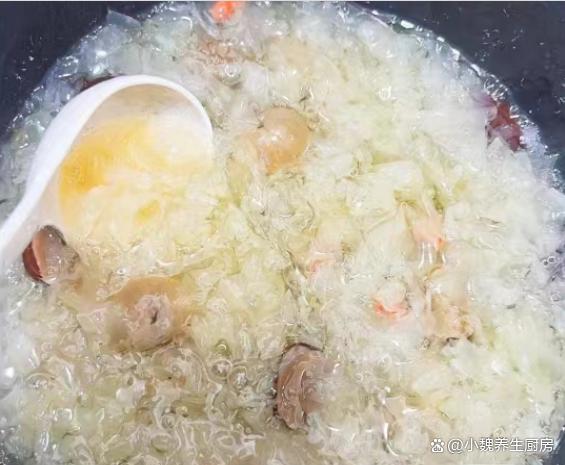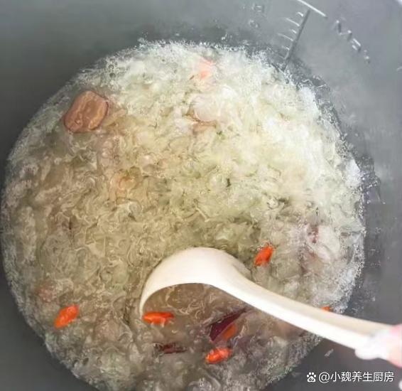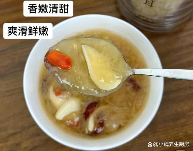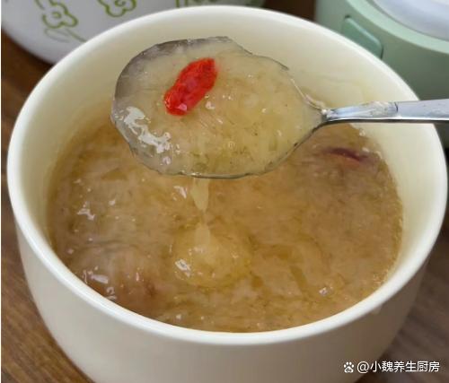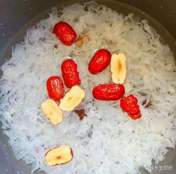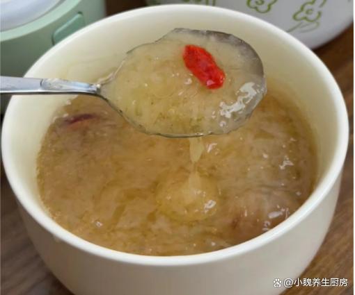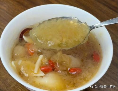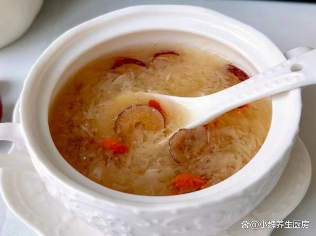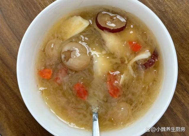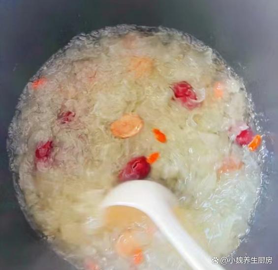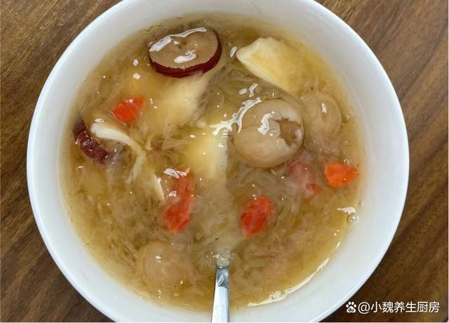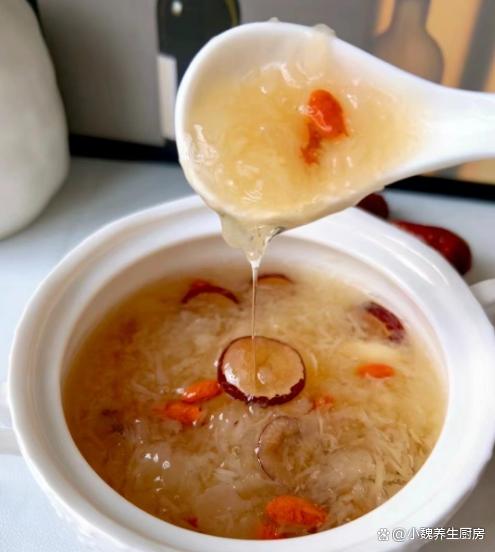 第五步:放入一些红枣和红枣片,加上少许冰糖,多加一些清水,转中小火继续炖煮,放入百合和桂圆肉,让营养都融入汤里。 第六步:让汤品煮至浓稠,胶质全部煮出来,丢入一些枸杞子,焖煮几分钟就可以了,这道桂圆银耳百合羹就制作完成了。 桂圆银耳百合羹的制作小贴士:首先,选择优质的食材是制作美味桂圆银耳百合羹的关键。桂圆应该选择肉质饱满、甜度适中的,银耳则要选颜色微黄、质地柔软、无异味的。至于百合,新鲜的百合口感更佳,颜色洁白无瑕,没有明显的斑点或瑕疵。 其次,处理食材也是一门学问。银耳需要提前泡发,至少需要泡发半个小时,待其完全展开后再用清水冲洗干净。桂圆则需要去壳去核,只保留肉质部分。百合则需要一片片地清洗干净,提前用温水泡发,撕掉一层半透明的物质。在制作过程中,火候的掌握也是非常重要的。一般来说,开始时可以用中火将食材煮至沸腾,然后转小火慢慢炖煮,以保持汤羹的口感和营养。同时,要注意不时地搅拌,防止食材沉底糊锅。 最后,调味也是提升桂圆银耳百合羹口感的关键步骤。一般来说,这款汤羹的甜度已经足够,不需要额外添加糖分。但如果喜欢的话,也可以适量添加一些冰糖或蜂蜜,增加口感的丰富度。同时,也可以根据个人口味添加一些枸杞或红枣,增加汤羹的营养价值。 总的来说,制作桂圆银耳百合羹需要耐心和细心,只有用心去做,才能品尝到其独特的香甜口感和丰富的营养价值。希望这些小贴士能帮助你制作出美味的桂圆银耳百合羹,享受美食的同时,也享受健康的生活。 你们是否掌握这款桂圆银耳百合羹的正确做法吗?(文中的配图都出自网络)