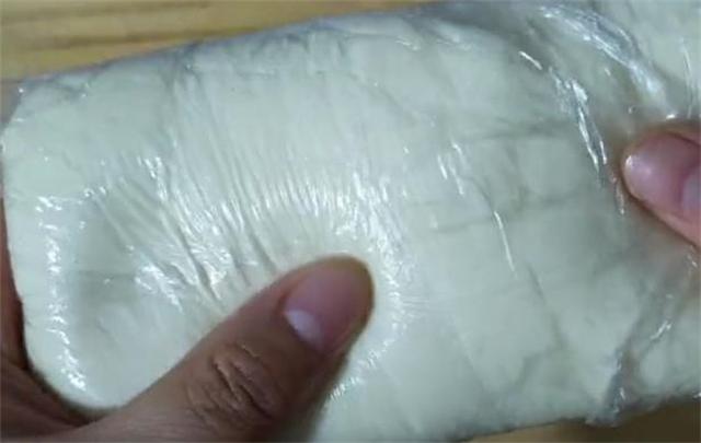 2.接下来这一步非常的关键,一定要多揉面,揉至光滑细腻,大约揉15分钟左右,把它搓成长条,然后像这样用保鲜膜把它包裹紧实定型,放冰箱冷藏发酵一夜。