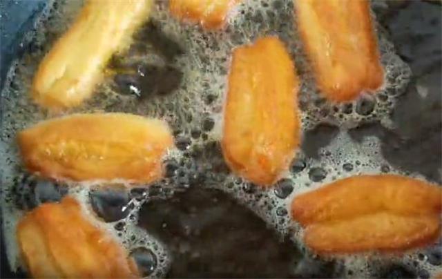 6.油温五成热稍微抻一下再下入生胚,这一步能够使内部的面筋拉长,这样我们炸的时候它才更容易鼓起来,全程中小火或者是小火不停的翻动,炸至油条飘起表面金黄即可出锅。