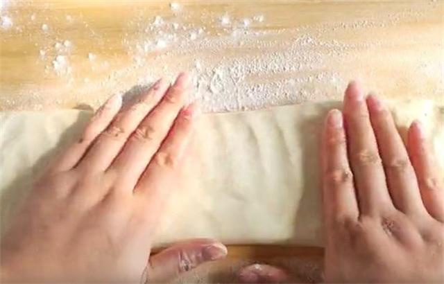 3.早起把发好的面向前后各拉伸一下,像这样把它抻长,这样能够不改变它的面筋形状,这样炸出的油条才会鼓起来,才会蓬松。