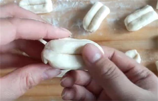 4.然后把它擀成厚度约半厘米的薄片,切2厘米的宽条,蘸上一层水,摞在一起,用筷子在中间的部分按压。(www.wS46.com)