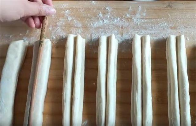 5.再把每一根大油条再分成2到3份的小油条,捏合两端防止炸开,因为个人家庭锅比较小,炸小油条的话会更加方便快速,做好的生坯可以醒五分钟,也可以不醒。