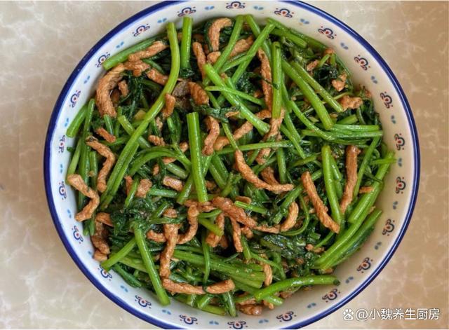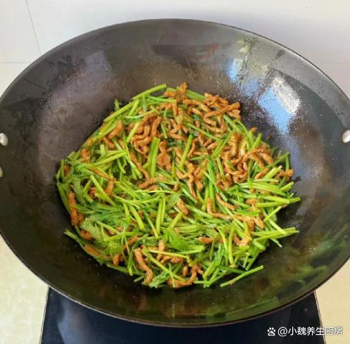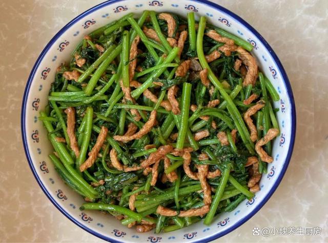 第六步:倒入洗净的茼蒿菜,先把根茎炒至断生,倒入叶子快速翻炒几下,加上生抽,蚝油和食盐等佐料,翻炒均匀,装盘出锅,这道茼蒿菜炒肉丝就制作完成了。 茼蒿菜炒肉丝是一款特别美味的菜肴,选用茼蒿菜和猪肉丝制作而成,闻起来特别香,肉丝也非常嫩滑,吃起来特别有食欲,茼蒿菜含有一些物质,既可以疏通肠道,还能改善失眠的情况,内行人经常吃它。 网友们,你们是否掌握这道茼蒿菜炒肉丝的正确做法吗?(文中的配图都出自网络)