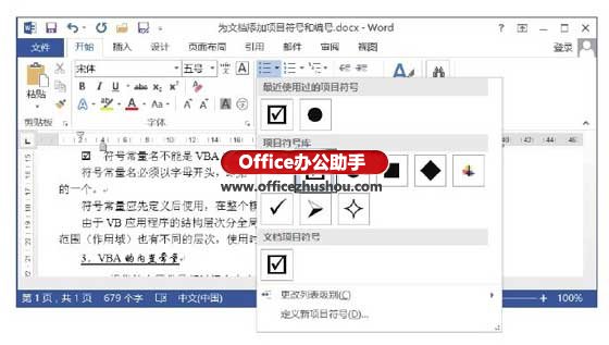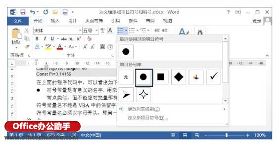 3、此时指定的符号将添加到了项目符号库列表中,选择该符号即可将其应用到段落中,如图4所示。