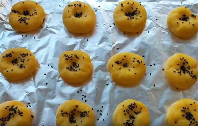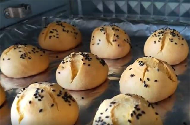4.把每一个面剂像这样向里翻转揉搓,揉成圆形的开花状,放在烤盘内,中间用手指按压一下,这样我们烤的时候它更容易开花,然后撒上一些黑芝麻,醒3到5分钟。
