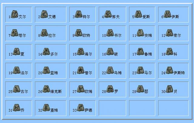 1、El 艾尔 50 命中率, 1 光明度 15 防御, 1 光明度,11 2、Eld 艾德 175%伤害力对不死系 50 命中率对不死系,15%体力耗费减慢,提升抵挡,11 3、Tir 特尔 每杀一个敌人 2 Mana,每杀一个敌人 2 Mana,每杀一个敌人 2 Mana,13 4、Nef 那夫 震退敌人,对远距离攻击 30 防御,对远距离攻击 30 防御,13 5、Eth 爱斯 -25% 目标防御,提升 mana 回复速度 15%,提升 mana 回复速度 15%,15 6、Ith 伊司 9 最大伤害力,15% 伤害转换到 mana,15% 伤害转换到 mana,15 7、Tal 塔尔 75 毒攻击 效果持续 5 秒,防毒提升 30%,防毒提升 35%,17 8、Ral 拉尔 5-30 火伤害,防火提升 30%,防火提升 35%,19 9、Ort 欧特 1-50 电伤害,防电提升 30%,防电提升 35%,21 10、Thul舒尔 3-14 冰伤害,效果持续 3 秒,防冰提升 30%,防冰提升 35%,23 11、Amn 安姆 每次命中偷取 7% 生命,敌人受到反伤害 14,敌人受到反伤害 14,25 12、Sol 索尔 9 最小伤害力,抵消物理伤害 7,抵消物理伤害 7,27 13、Shael沙尔 20% 提升攻击速度 20%,快速恢复打击,20% 快速抵挡率,29 14、Dol 多尔 命中后吓跑怪物概率 25%,自动恢复生命 7,自动恢复生命 7,31 15、Hel 海尔 装备要求 -20%,装备要求 -15%,装备要求 -15% 16、Io 埃欧 10 活力,35 17、Lum 卢姆 10 能量,37 18、Ko 科 10 敏捷,39(www.ws46.coM) 19、Fal 法尔 10 强壮,41 20、Lem 蓝姆 75% 得到额外金钱,50% 得到额外金钱,50% 得到额外金钱,43 21、Pul 普尔 75% 伤害力对恶魔 100 命中率对恶魔,30% 提升防御,30% 提升防御,45 22、Um 乌姆 25% 概率造成伤口,四防 15,四防 22,47 23、Mal 马尔 防止怪物治疗,抵消魔法伤害 7,抵消魔法伤害 7,49 24、Ist 伊司特 30% 提升MF,25% 提升MF,25% 提升MF,51 25、Gul 古尔 20% 提升攻击命中率, 5% 防毒上限, 5% 防毒上限,53 26、Vex 伐克斯 每次命中偷取 7% Mana, 5% 防火上限, 5% 防火上限,55 27、Ohm 欧姆 50% 伤害力, 5% 防冰上限, 5% 防冰上限,57 28、Lo 罗 20% 概率双倍打击, 5% 防电上限, 5% 防电上限,59 29、Sur 瑟 命中后使目标失明,提升 Mana 上限 5%, 50 点 Mana,61 30、Ber 贝 20% 概率决定性打击,抵消物理伤害 8%,抵消物理伤害 8%,63 31、Jah 乔 忽略目标防御,提升生命上限 5%, 50 生命,65 32、Cham查姆 冰冻目标 3,不被冰冻,不被冰冻,67 33、Zod 萨德 永不磨损,69 在暗黑2中,符文一共有33种不同的等级,分别用数字1到33来表示。等级越高的符文代表着更加稀有和强大的效果。例如,等级为1的符文只能用于制作较为简单的符文词缀,而等级为33的符文则可以制造出最为强大的符文词缀。