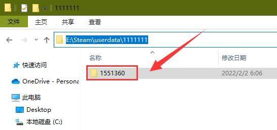 Steam版:Steam\userdata\用户ID\后面就是一串数字“Steam”指的是你自己的Steam文件夹,我并不知道你Steam安装在哪里。下图示例是表示我自己的Steam装在E盘;“用户ID”指得是你自己的用户名,一般是一串数字。如果你只登录一个账号,那唯一的数字文件夹就是。下图示例这个数字是我自己的用户名,你的用户名肯定跟我不一样;