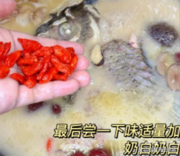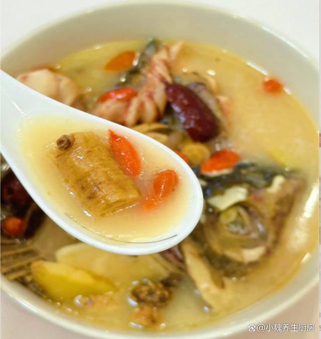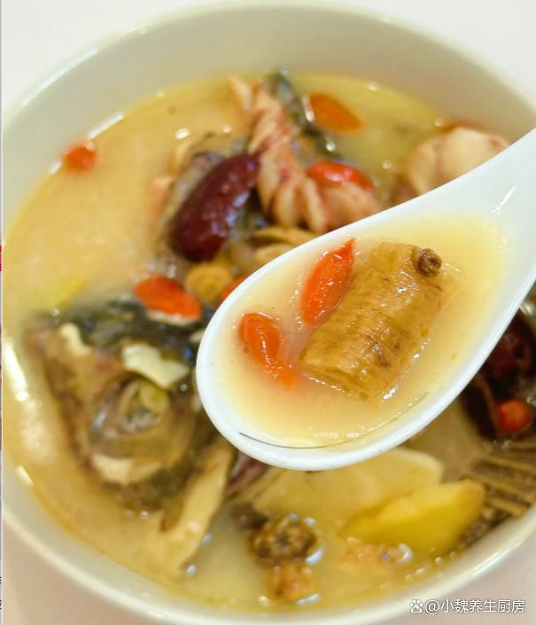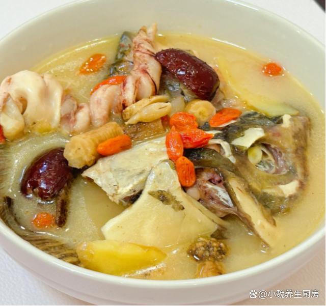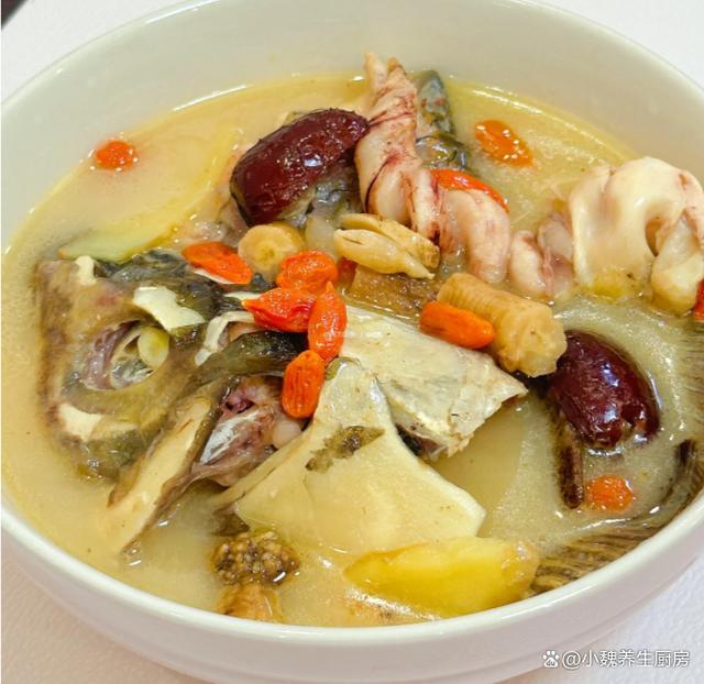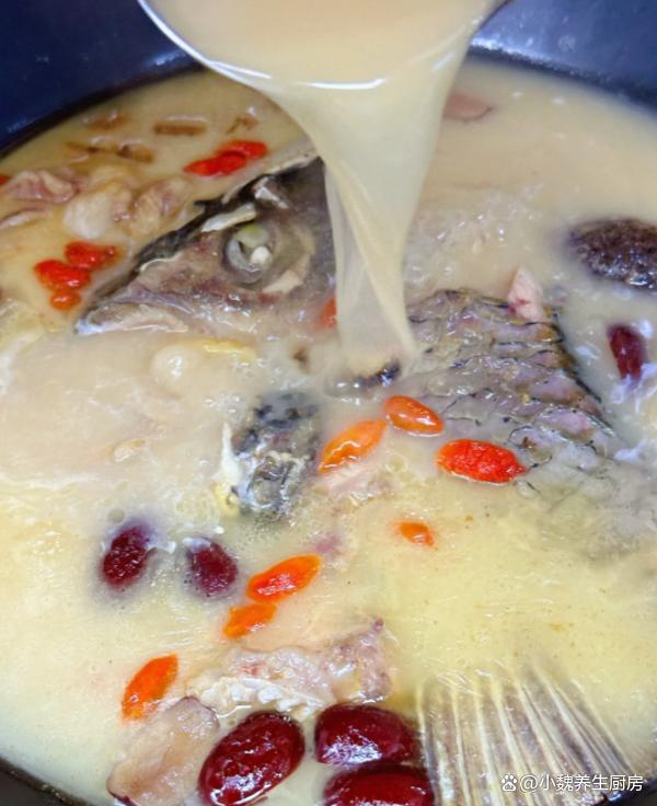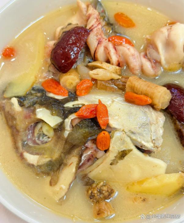 第七步:放入一些红枣和陈皮,中小火炖煮35分钟,让汤汁煮至奶白,丢入一些枸杞子,加上食盐和胡椒粉少许,撒上葱花点缀,这款党参北芪陈皮鱼头汤就制作完成了。 党参北芪陈皮鱼头汤的制作小贴士:首先,选择新鲜的食材至关重要。鱼头应选用肉质饱满、鱼眼清澈的新鲜鱼类,如鲢鱼头、鳙鱼头等,以确保汤品的口感和营养价值。同时,党参、北芪和陈皮等中药材也要选用优质产品,确保其药效的发挥。其次,注意火候的掌握。在炖煮过程中,应保持适中的火候,避免过大或过小。一开始可用中火炖煮,待汤品逐渐沸腾后转小火慢炖,这样既能保证鱼头炖煮至熟,又能让中药材的营养成分充分渗出,使汤品更加浓郁醇厚。 此外,汤品的口感和营养价值也与炖煮时间密切相关。建议将鱼头与中药材一同炖煮至少1小时以上,让汤品充分吸收药材的滋补成分。同时,也要注意适量添加开水,避免汤品过于浓稠或稀薄。在调味方面,可根据个人口味适量添加盐和胡椒粉等调味品。建议在汤品炖煮即将结束时添加,以免破坏汤品的原汁原味。 党参北芪陈皮鱼头汤是一款特别美味的鱼汤,选用新鲜鱼头和几种食材,简单炖一锅,汤汁浓郁,色泽乳白,喝起来特别鲜美,暖胃养胃,补充蛋白质和其他营养,让大脑更加聪明,早食早受益。 小伙伴们,你们是否喝过这款党参北芪陈皮鱼头汤吗?(文中的配图都出自网络)