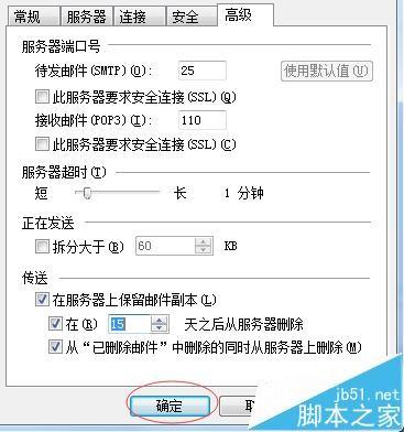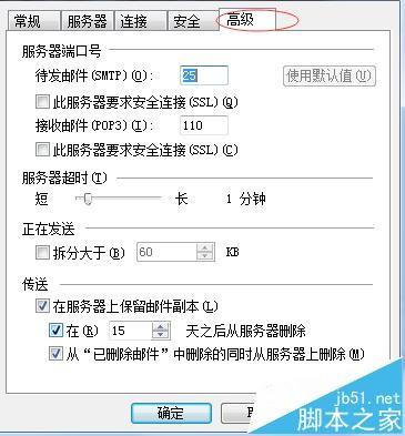 这是最重要的一步了,请看好配置,请将“传送”中“在服务器上保留邮件副本”的选项勾上,在紧接的下一行同样进行打勾,并对天数进行调整,如下图截屏中标红的位置。 范例中设置15天是指邮件在服务器上只保存15天,到第16天的时候服务器自动会把15天前的邮件进行删除,用户可以根据自己的邮件数量来调整这个天数。