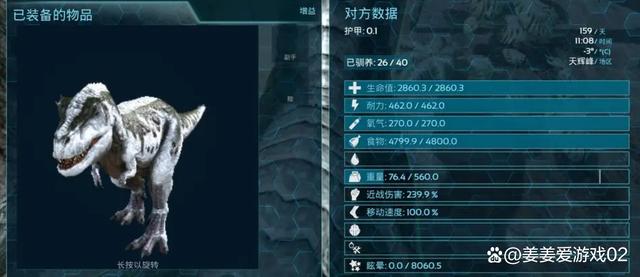 在饲料方面,建议大家优先使用巨蝎蛋作为饲料,这也是霸王龙最喜爱的食物。而在没有巨蝎蛋的情况下,我们也可以使用优质生肉、熟肉、生鱼肉以及生肉这四种肉类材料驯养霸王龙。当然了,这四个的优先值是从高到低的。而在驯养过程中,也是建议大家在霸王龙背包里放置水袋、玉米、紫色浆果。 |