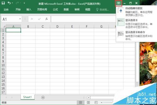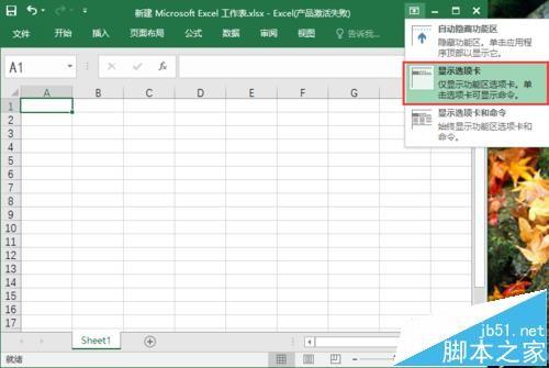 3、若想再显示命令,点击”功能区显示选项“,再点击”显示选项卡和命令“,命令即显示