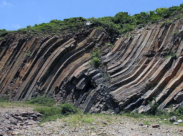 弯曲岩层代表地: 香港地质公园: 中国香港世界地质公园是位于香港东北部,面积49.85平方千米。2011年9月18日经联合国教科文组织批准为第七批世界地质公园。由西贡火山岩园区和新界东北沉积岩园区组成,包括8个景区。西贡火山岩园区包括粮船湾、甕缸群岛、果洲群岛和桥咀洲4个景区。