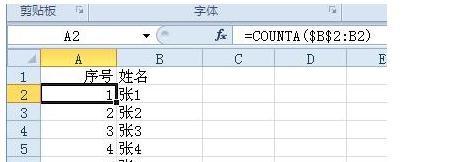 可以对序号列使用公式:=COUNTA($B$2:B2),并下拉填充;这样序号就是连续的,如果删除其中的行,序号仍然连续。