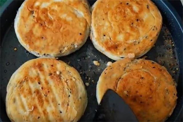 7.电饼铛开小火,油温微热,下入饼坯,然后我们盖上盖子调成最小火,焖1.5分钟到2分钟左右,时间到我们开盖翻面,这个时候也可以再盖上盖子烙,也可以不盖盖子,不盖盖子就是反复翻面,用最小火直至烙至两面金黄酥脆即可,这样长时间小火慢烙,外皮会更加酥脆。