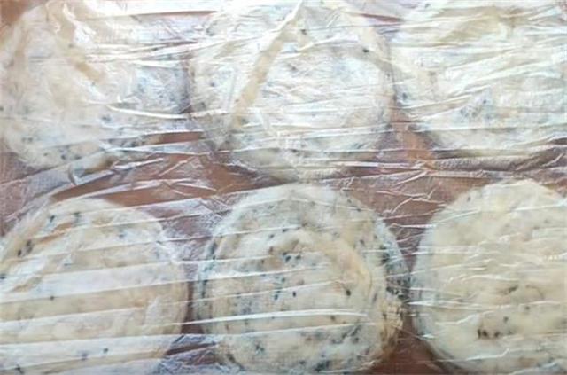 6.捏合两端,然后旋转着把它按扁,做成生坯,旋转一下能够使饼的层次看起来更加丰富,醒五分钟之后,我们把饼皮按扁,然后盖上保鲜膜二次醒发十分钟左右,醒发至饼鼓起即可。