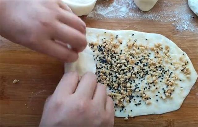5.案板上抹油,把面剂直接抻长按扁,按成椭圆形的大薄片,涂抹油酥,撒上一层花生碎,然后像这样折叠着卷起。