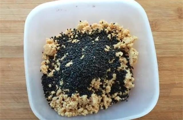 2.接下来准备150克到200克的花生,把外皮去掉,放在袋子中用擀面杖敲打擀碎,放入碗中备用,也可以加入一把黑芝麻搅拌均匀。