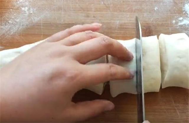 4.接下来我们把发好的面放在案板上揉搓排气,多揉一会儿排出空气,这样能够使面团更有韧性,然后把它搓成长条,分成8份。