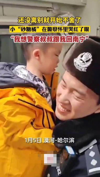 在1月5日那趟穿越漠河与哈尔滨的雪国列车上,一个名叫砂糖橘殿下的小朋友,紧紧地抱住一位警察叔叔,眼中满是不舍与渴望。他希望能随这位警察叔叔一同回到南宁的温暖怀抱。 这一幕,展现出了东北警察叔叔那深藏于心的柔情,也让我们深深感受到黑龙江人民对这片土地的深厚情感。这位小朋友,短短几天的时间,便已学会了一口地道的东北话,那份对生活的真挚情感让人心生敬意。警察叔叔对砂糖橘的细心呵护,如同北国的春风,温暖而不炙热。