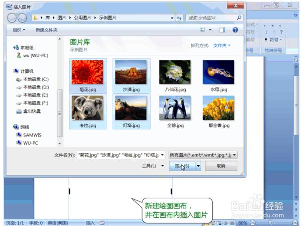 3、调整好画布大小后,下一步就是在画布内插入图片。鼠标移动到插入下面的“图片”功能,点击它弹出一个插入图片的路径窗口,在路径中找到并选中你要插入到word里面的几张图片,最后点击插入。
