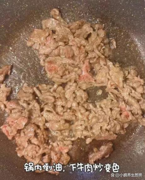步骤5:锅底提前烧热乎,加上少许食用油,油温烧热以后,滑入腌制好的牛肉丝,将其炒至变色。