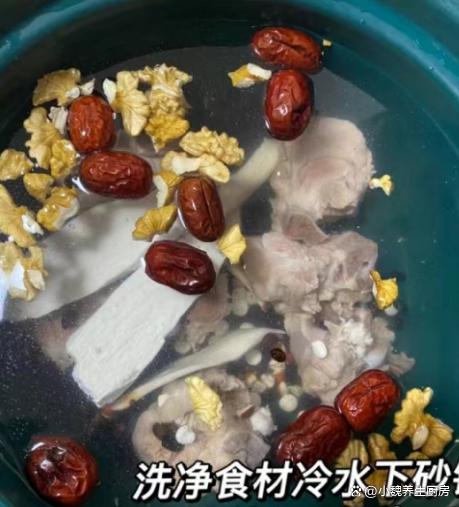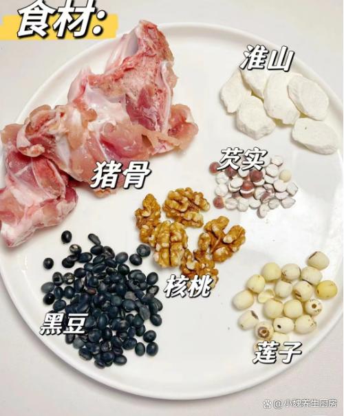 时间悄悄地度过了,到了4月最后一周,每年季节交替的时候,都是容易感冒和生病的时候,特别需要给身体储备能量,才能让工作更有精神。春季尾声,很多人的气色非常差,脸色非常苍白,身体特别虚弱,这个时候要适当进补,多喝一些温补的汤品,比如说这款黑豆核桃莲子猪骨汤,汤品十分滋补,补血效果出色,改善失眠的情况,不懂吃可惜了。春季喝汤,宁愿少喝鸡汤,也要多喝这汤,补血安神,增强免疫力。  【黑豆核桃莲子猪骨汤的详细做法】 食材明细:选购优质干莲子25克左右(莲子分为白莲子和红莲子,品种不一样,都非常适合煲汤,具有静心安神的效用),干淮山药20克左右,选购优质猪骨500克左右(猪骨分为很多部位,骨头里都是营养,搭配各种食材都能煲汤),芡实一小把,核桃4-5个(核桃又叫“补脑之王”,是一种非常常见的干果,核桃既可以直接生吃,还可以用来煲汤,具体补脑安神,改善气血的目的),黑豆40克左右,温水和冷水少许,葱姜少许,一丢丢食盐,料酒几勺,其他。 详细制作顺序: 第一步:提前选购好黑豆,核桃,莲子,芡实和猪骨等食材,先把黑豆用流水冲洗,黑豆用冷水泡发一会儿,最后捞出备用。 第二步:将核桃去掉外壳,芡实和山药用清水洗净,生姜切成厚度相同的片子,香葱洗净打成葱结。第三步:将干莲子提前洗净,用温水泡发2个小时,猪骨全部剁成块状,猪骨一定要用清水洗净,或者用面粉水浸泡,重复清洗几次,备用。