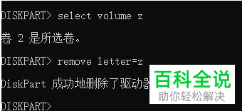 6.小编误显示的EFI分区的盘符为Z: ,将分区Z选中:然后删除挂载点即可。 select volume EFI分区盘符 remove letter=EFI分区盘符