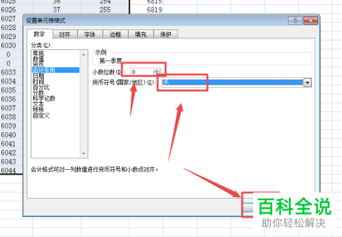 5. 然后在右侧,小数位数栏,设置为0,货币符号栏设置为“无”,最后,点击右下角的确定;
