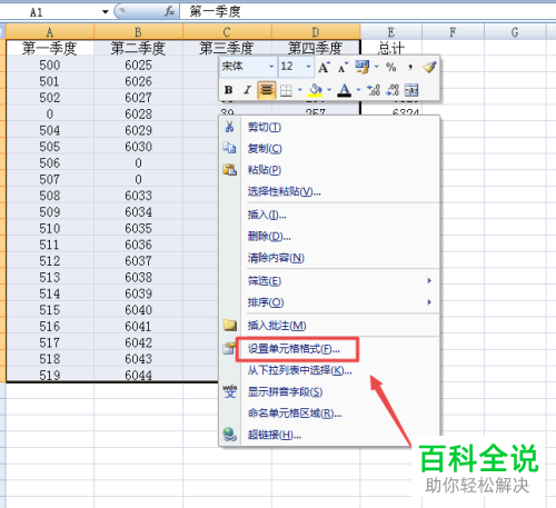 3. 将表格全部选中后,右键,在打开的菜单中,选择“设置单元格格式”选项;